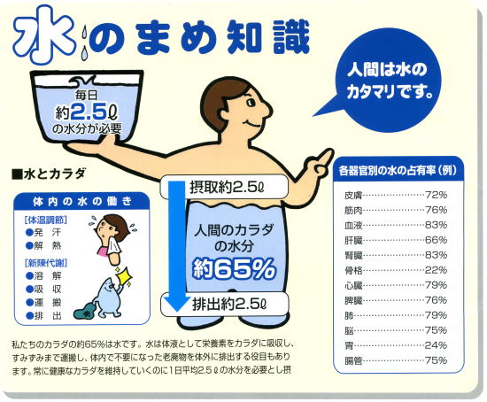 赤ちゃんは80%が水分だと言われます。年配になると50%ほどになることもあります。それで人間の身体の水分は平均して65%ということになります。