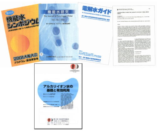 左から ・第8回 機能水シンポジウム 2001年大阪大会 講演集 ・日本機能水学会発行 機能水研究 ・(財)機能水研究振興財団発行 電解水ガイド
