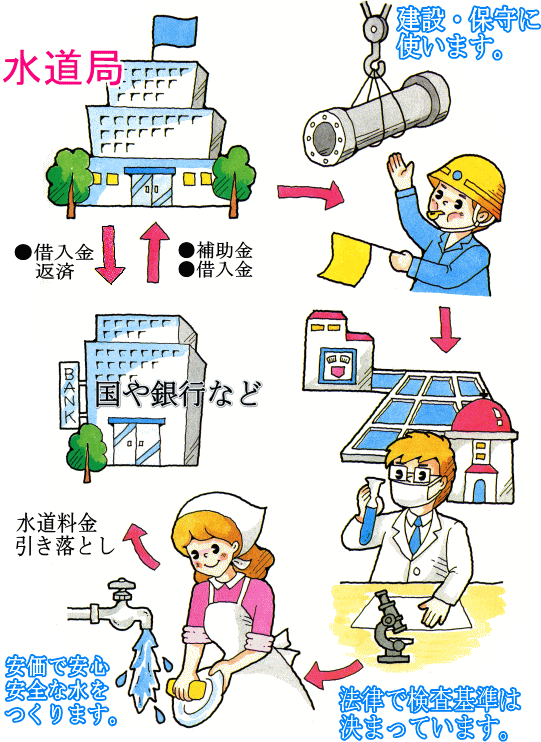 ダム等の水道水源の開発、水道の広域化、農山漁村での小さな水道の整備等の費用は、国からの補肋金や借入金などによってまかなわれています。